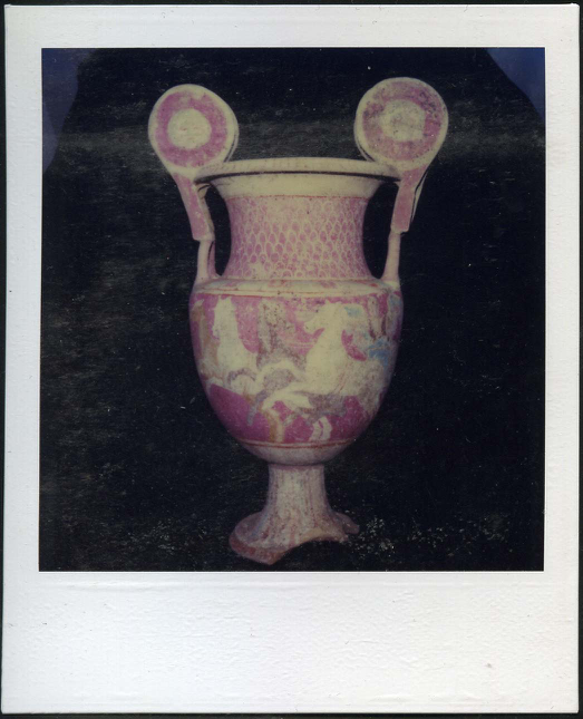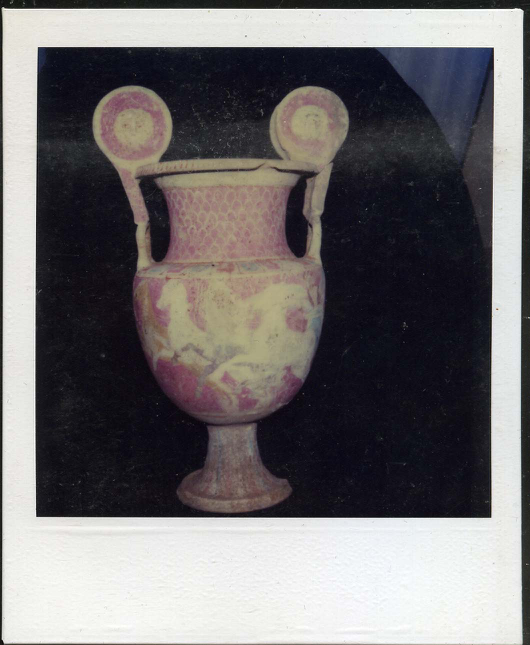 Two of these objects were Canosan volute kraters (Christie’s 2012, lot 99), which matched two Polaroid images in the archive (Figures 1 and 2). In the Medici Polaroids, the two kraters are depicted in front of a black cloth, a background which brings out their decoration, but they are unclean and missing parts of their bases; one of them is also missing a piece of its rim (Figure 1). The number printed on the back of each Polaroid image is identical, proof that the two kraters were photographed with the same film. It is also an indication that the objects arrived together and passed as a pair through the hands of Medici.