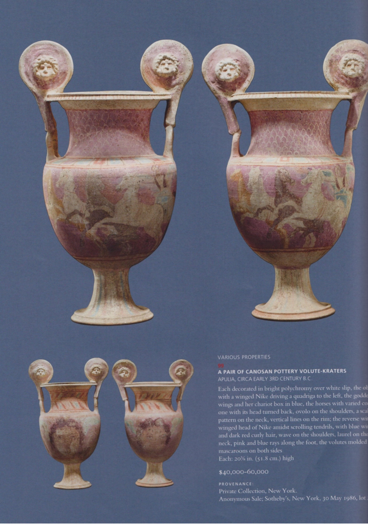 The kraters, which had an estimated sale value of $40,000–60,000, remained unsold and, according to Bernheimer’s email, were returned to the seller, without its being clear if the 2012 seller was the same “private collection, New York” which acquired them from Sotheby’s in 1986.