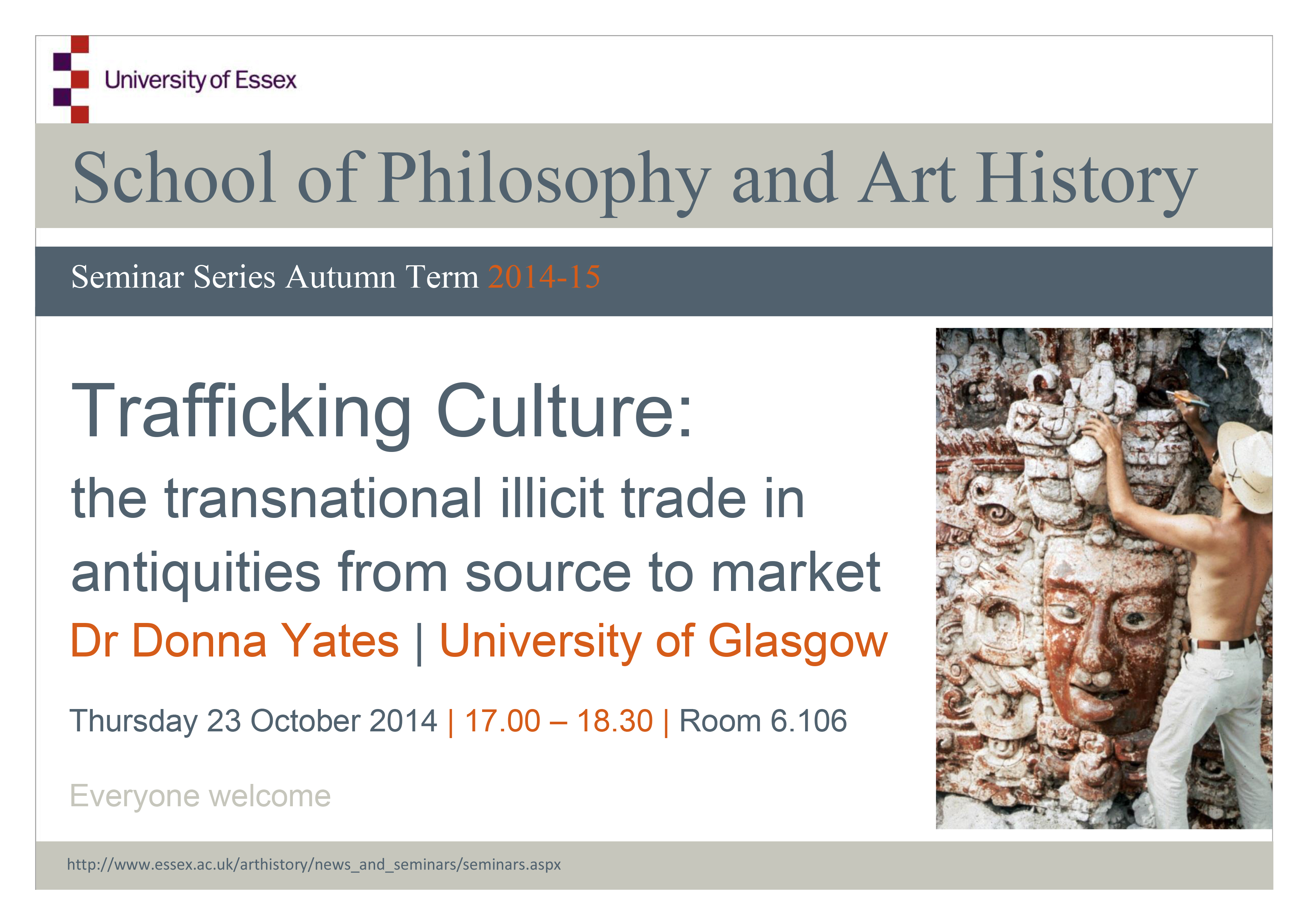 On Thursday, 23 October she will be at the University of Essex’s School of Philosophy and Art History Seminar Series presenting “Trafficking Culture: the transnational illicit trade in antiquities from source to market”. This will be at 5pm in room 6.106.