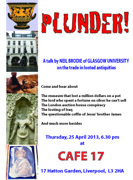 Neil Brodie will give a talk on the trade in looted antiquities in Liverpool on 25 April. The talk will be at 6:30pm at Cafe 17, 17 Hatton Garden, L3 2HA. All are welcome to attend.